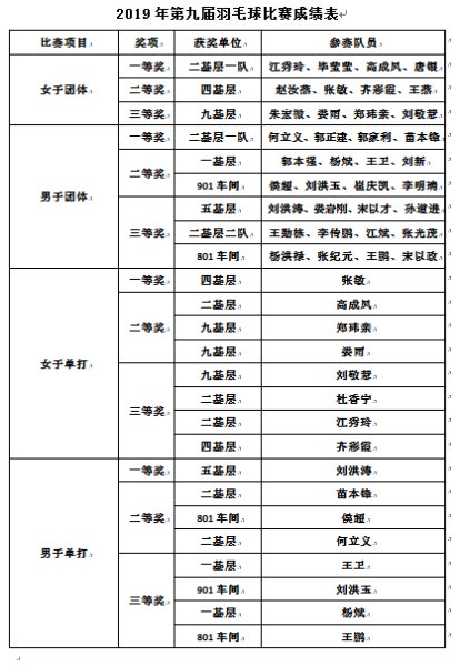 場上隊員聚精會神、拼盡全力,場下觀眾掌聲不斷、歡呼雀躍,充分展現(xiàn)了公司員工奮勇爭先、努力拼搏的精神面貌。經(jīng)過激烈的比拼,張敏、劉洪濤一路披荊斬棘、過關(guān)斬將,分別獲得女子單打一等獎和男子單打一等獎;男子團體一等獎和女子團體一等獎分別被二基層男子一隊、二基層女子一隊收入囊中。